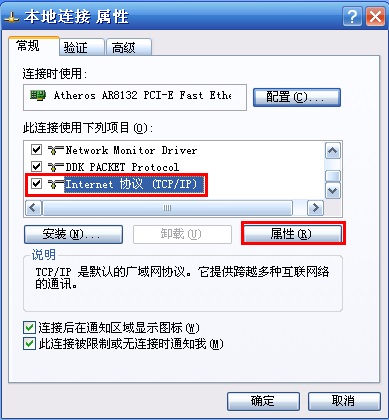 第三步:出现本地连接属性的对话框后,找到并点击 Internet协议(TCP/IP),点击 属性。如下图所示: