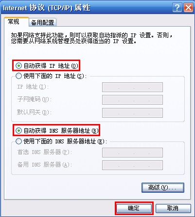 第四步:选择 “自动获得IP地址”、“自动获得DNS服务器地址“,点击 确定。如下图所示: