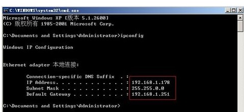 2、在CMD窗口里,输入IPCONFIG,即可看到IP,如图。第一行是IP地址,第二行是子网掩码,第三行是网关。