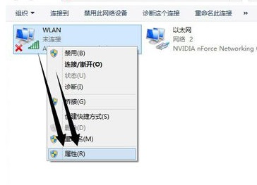 第二步:右键无线连接选择【属性】或者在启用状态下双击也可以。