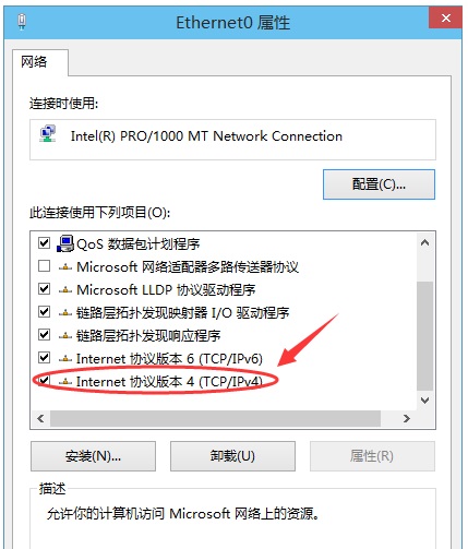 第三步:在以太网属性上找到“TCP/IP协议v4"并双击打开,如下图所示。