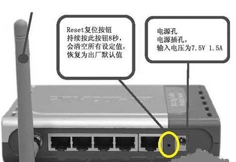 这个方法最简单,直接按路由器上的“reset”键。就可以恢复路由器出厂设置。reset键一般位于路由器的后面,一个凹进的按钮,需要用细长的东西(如牙签等)按住按钮,则可复位。每个厂家的设备都不大一样,一般长按几秒,等前面的灯全灭之后再亮即服务成功。
